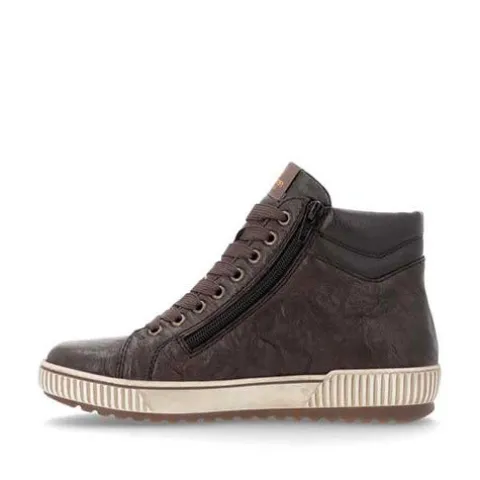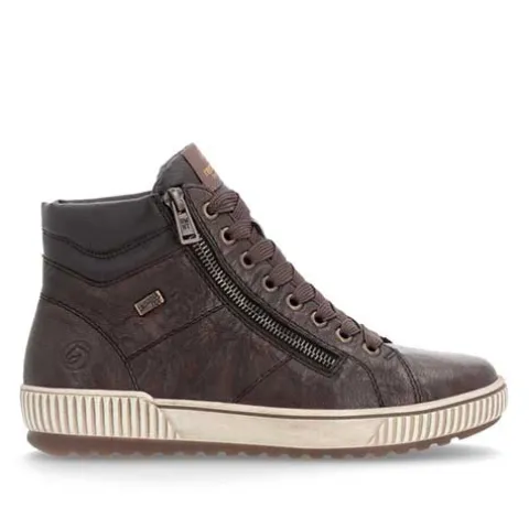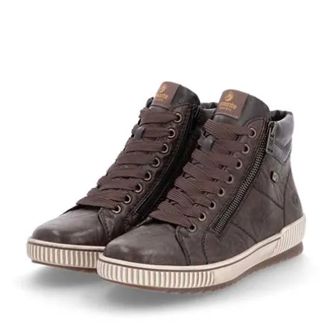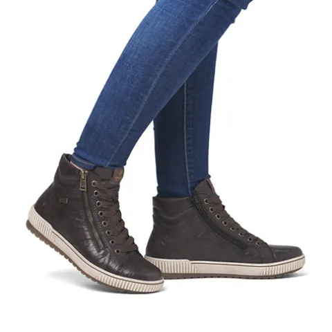 Lækker ankelstøvle med en overdel af glat skind og syntet med en karakterfuld struktur for at understrege det urbane look. Støvlen justeres med brede snørebånd og lukkes med to lynlåse på siderne af snørebåndet. Åbningen er let polstret, og med vidde G er støvlen mere rummelig. Indvendig har støvlen et let foer, og Remonte-Tex-teknologien gør støvlen kraftig vandafvisende. Den udtagelige Remonte-soft-indersål er støddæmpende og komfortabel, og den fleksible gummiydersål er stødabsorberende med et godt fodfæste.