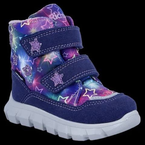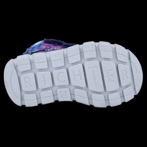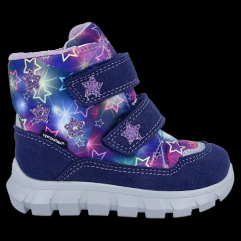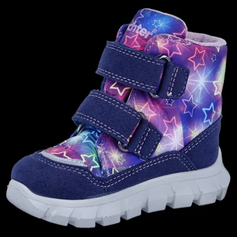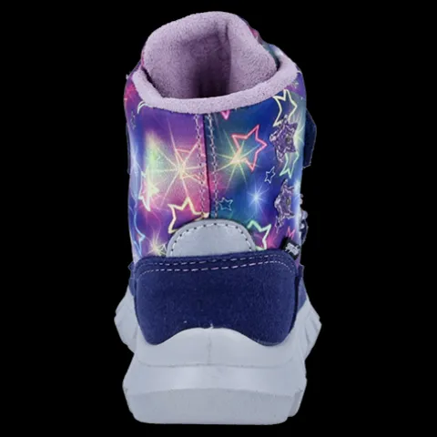 Dejlig og vandtæt vinterstøvle med LED. Overdelen er af syntet og tekstil med refleksdetaljer på snude og hæl og tre stjerner med LED-lys på ydersiden af anklen, der blinker, når støvlen rammer jorden. Støvlen lukkes med to velcroremme, og åbningen er polstret for øget komfort. Indvendig har støvlen et blødt, varmt foer, og sammen med en åndbar, 100 % vandtæt og PFAS-fri Sympatex®-membran holdes fødderne varme og tørre. Indersålen kan tages ud, og den fleksible ydersål er stødabsorberende med et godt fodfæste.