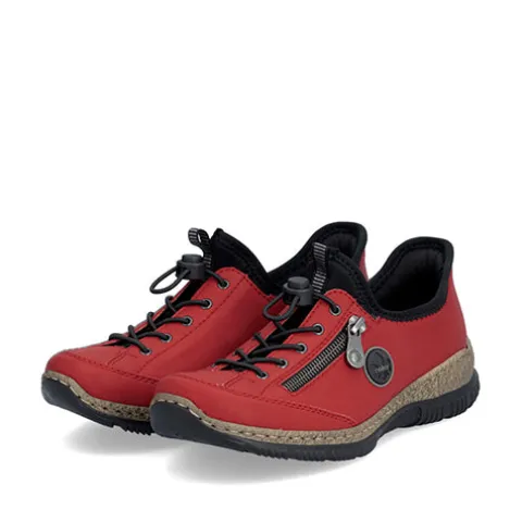Spændende sko med en ny funktion! Ready2GO er Riekers bud på en sko med fast hælkappe, så du nemt kan træde i skoen uden at bukke dig eller bruge dine hænder. Skoen har en justerbar elastiksnøre, en trækfane på pløsen og en pyntelynlås på ydersiden, og overdelen er af tekstil og syntet i læderlook. Indvendig er skoen udstyret med et åndbart tekstilfoer. Med komfortvidde er der mere plads om forfoden. Den polstrede og bløde Antistress-indersål sikrer dig komfort hele dagen, imens den fleksible, stødabsorberende ydersål giver et fint fodfæste. Modellen er let, fleksibel, rummelig og stødabsorberende og er designet i smukke og bløde materialer.