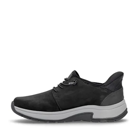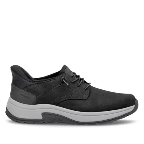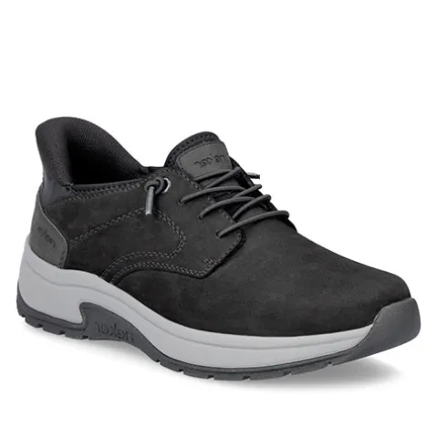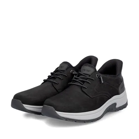 Lækker Ready2GO sko med en overdel af nubuck, og pløsen er af elastisk tekstil. Skoen er designet med den smarte Hands Free Ready2Go-teknologi, der gør det nemt at tage skoen på uden brug af hænder takket være den faste, polstrede hælkappe og elastiske snøring. Den elastiske snøring er ikkejusterbar, men sørger for tilpasning til foden i løbet af dagen. Med vidde H er der ekstra plads om forfoden, og Rieker Antistress-teknologi gør skoen let, fleksibel og affjedrende, hvilket sikrer god støtte og komfort hele dagen. Den udtagelige indersål er polstret og komfortabel, og ydersålen er stødabsorberende med et godt fodfæste.