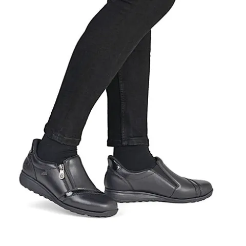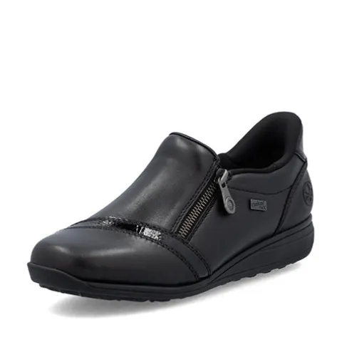 Dejlig sko med tex og ekstra vidde. Overdelen er af glat skind og syntet med lakdetaljer på forfoden og hælen. Skoen lukkes med en lynlås på ydersiden og har en elastikkile på indersiden, og som en Ready2GO-model træder du nemt i skoen pga. den faste hælkappe. Med ekstra vidde er der plads til den bredere fod, og med en vandafvisende RiekerTEX-membran holdes fødderne behagelige. Den udtagelige indersål er polstret, støddæmpende og komfortabel, og den fleksible gummiydersål er stødabsorberende med et godt fodfæste.