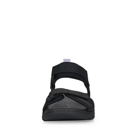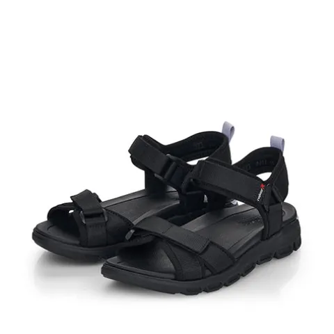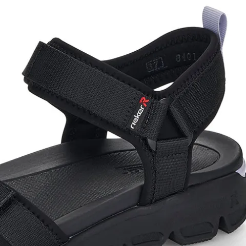 Sporty sandal fra Rieker med tekstiloverdel og lette såler. Modellen er med vekcro over forfod og ved vrist.