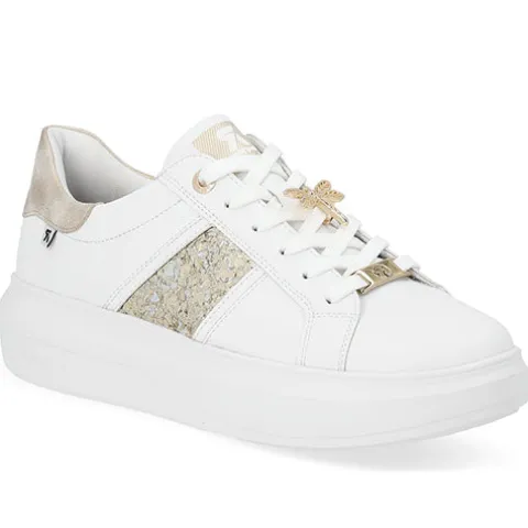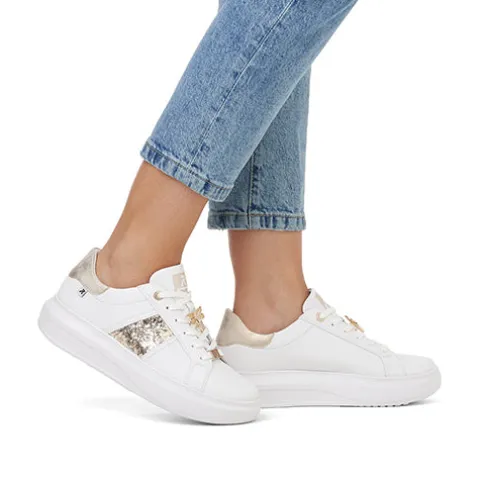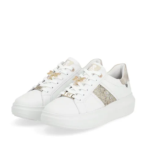 Let og feminin Revolution sneaker med en hvid overdel af glat skind og syntet, dekoreret med guldfarvede detaljer, bl.a. et glitterpanel på ydersiden, guldringe om de to øverste snørehuller, et logo-emblem forneden på snørebåndet og en guldsmed midt på snørebåndet, som kan tages af. Skoen lukkes med snørebånd. Indvendig har skoen et let mikrovelourfoer med Drysport-teknologi, som sikrer åndbarhed og komfort. Den udtagelige indersål er polstret og komfortabel, og den flade, chunky EVA-ydersål er let, fleksibel og stødabsorberende.