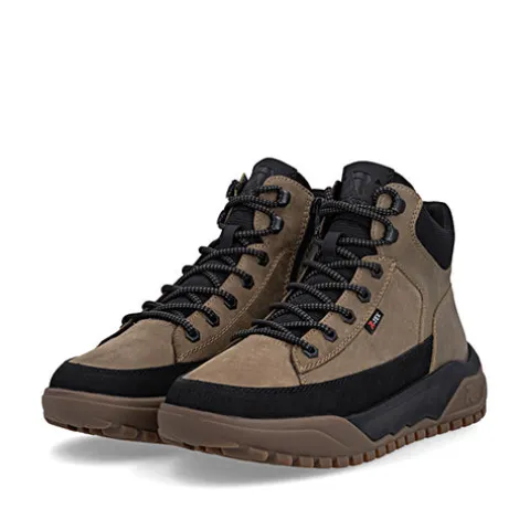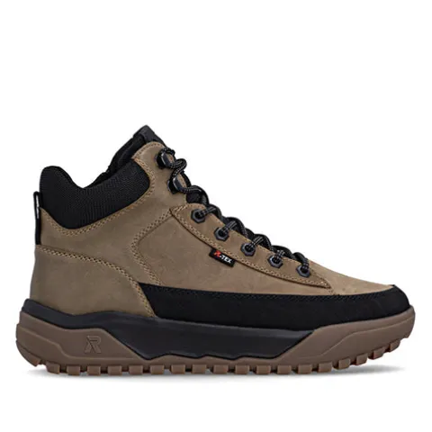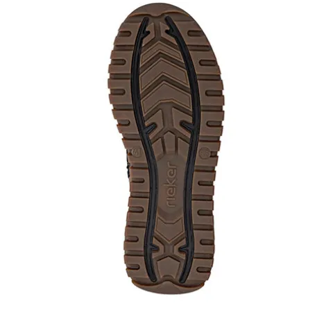 Kraftigt vandafvisende vinterstøvle med Rieker-TEX og en overdel af tekstil og syntet. Støvlen justeres med snørebånd og lukkes med en lynlås på indersiden af anklen, åbningen er godt polstret, og en trækfane på hælen gør det nemt at træde i støvlen. Med vidde G er der mere plads om forfoden. Indvendig har støvlen et varmt foer, og sammen med Rieker-TEX-membranen holdes fødderne varme og tørre. Den udtagelige indersål har Thermo-Foil og beskytter dermed ekstra mod kulde nedefra. Indersålen er desuden polstret og komfortabel, og den kraftigt mønstrede gummiydersål er stødabsorberende med et godt vejgreb.