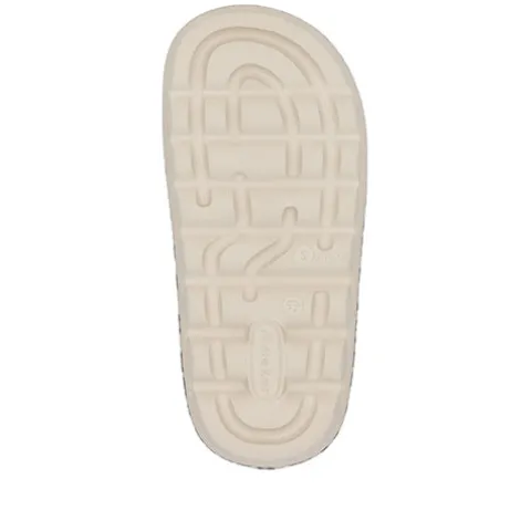 Dejlig slippers-sandal af stødabsorberende, blødt PU-skum med leopardprint. Sandalen er flad med en 3 cm høj plateausål og holdes på plads med to remme over vristen. Remmene kan justeres med spænder. Sandalen er fleksibel med et fint fodfæste.