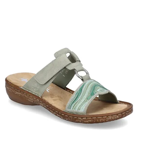 Sød slippers-sandal med en overdel af syntet i ruskindslook, som på forfoden er dekoreret med brodering i grønne nuancer og sølvfarvet tråd. En sølvfarvet ring forbinder overdelens to remme. Sandalen kan justeres over vristen med velcro. Antistress-indersålen er komfortabel, og ydersålen er fleksibel med et fint fodfæste.