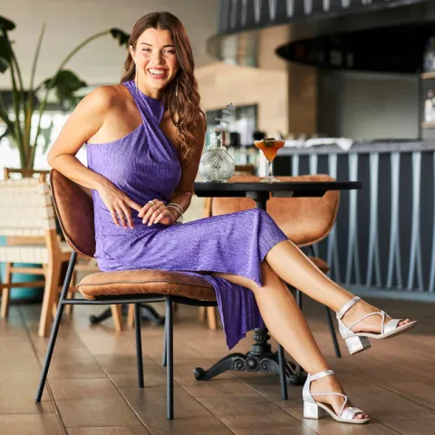 Festlig sølvfarvet sandal med blokhæl. Overdelen er af syntet i læderlook med sølv, dekoreret ned over vristen med to smalle remme belagt med masser af funklende similisten, og den ca. 6 cm høje blokhæl giver et feminint look. Sandalen har lukket hælkappe og lukkes med en velcrorem om anklen, og den har Antistress-indersål.