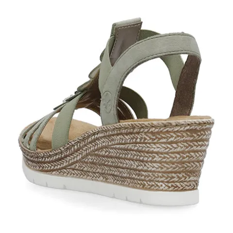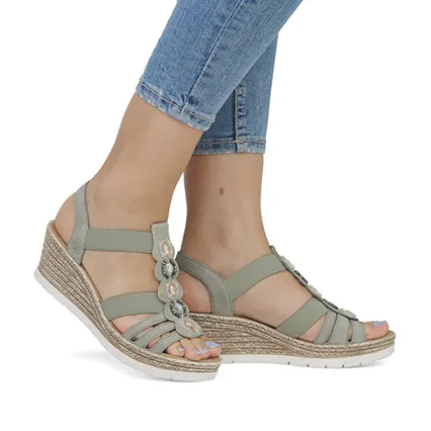Fin sandal med pynt og hæl. Overdelen er af syntet i ruskindslook, dekoreret med blå og gule plastdiamanter omgivet af facetslebne perler, samt elastikremme over forfoden og vristen, så sandalen tilpasser sig foden i løbet af dagen. Antistress-indersålen er komfortabel, og den 6 cm høje kilehæl med en imitation af flettet jute føles lavere pga. den ca. 2-2,5 cm høje plateausål under forfoden. Ydersålen giver et fint fodfæste.