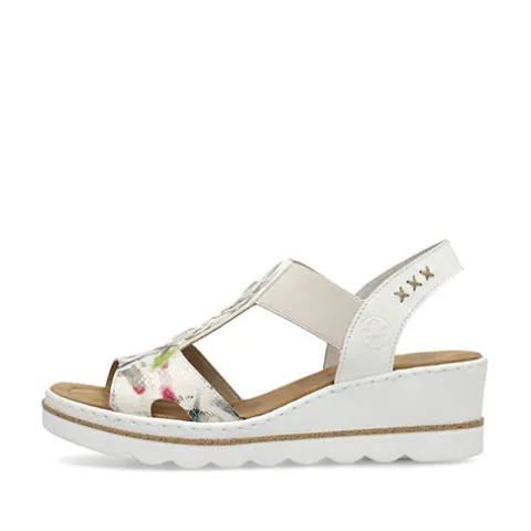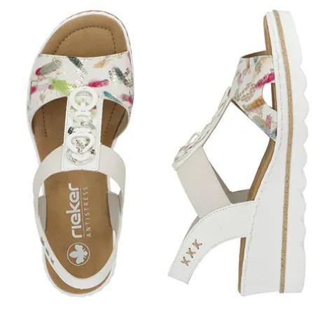 Sommersandal med kilehæl og multifarvede detaljer på vristen. Overdelen er af syntet, dekoreret med udskårne ringe på vristen, og kilehælen giver et feminint look. En elastikrem holder sandalen på plads på foden. Antistress-indersålen giver en fin komfort, og den kraftige ydersål giver et fint fodfæste.