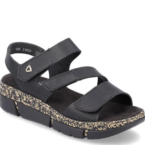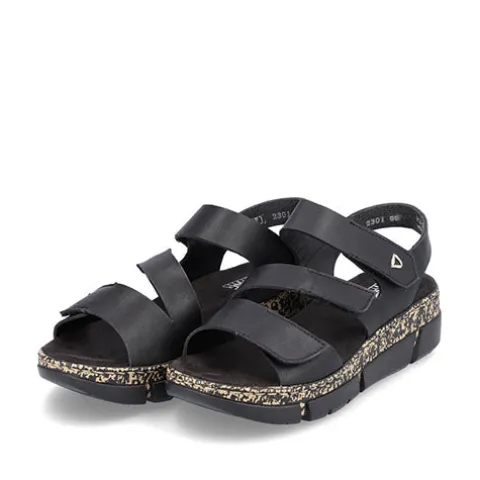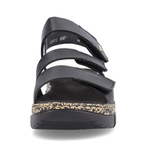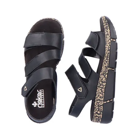 Blød og lækker sandal fra Rieker med fine detaljer samt en god, blød og fleksibel bund. Sandalen har tre justerbare velcroremme, som gør den nem at få på og af.