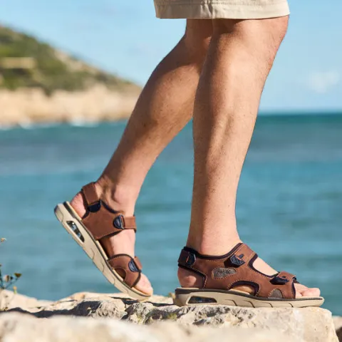 Komfortabel trekkingsandal med en overdel af imiteret skind foret med blødt tekstil. Sandalen lukkes med tre brede velcroremme (forfod, vrist og hæl) for optimal tilpasning til foden, og en bred siderem på ydersiden giver øget stabilitet. Med vidde H er der plads til den bredere fod. Den polstrede indersål beklædt med tekstil er støddæmpende og komfortabel, mellemsålen med en synlig boble er stødabsorberende, og den slidstærke og fleksible ydersål er stødabsorberende med et godt fodfæste. Denne lette sandal er perfekt til lange gåture og sommeraktiviteter.
