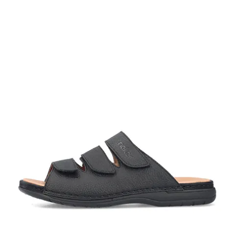 Dejlig slippers-sandal med en overdel af olieret skind. Sandalen reguleres med tre velcroremme over forfod og vrist, og den skindbeklædte Antistress-dæksål er komfortabel. Den fleksible ydersål er stødabsorberende.