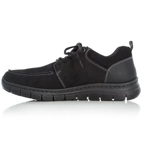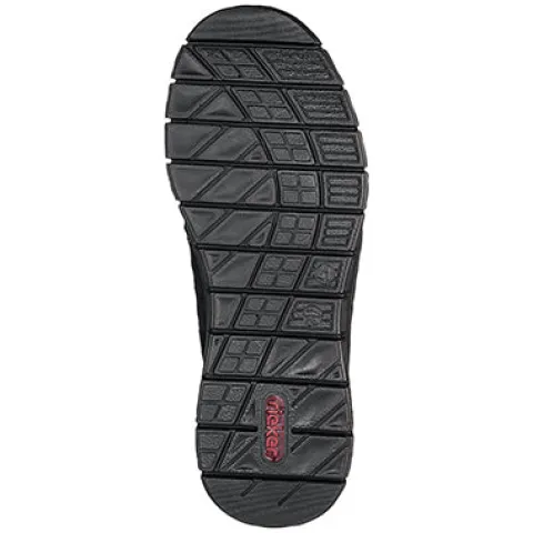 Komfortabel og anvendelig Riekersko. Skoen er med tekstilsnørerbånd og har god polstring rundt i åbningen. Den er foret med tekstil og har en blød dæksål, som gør den meget behagelig at have på en hel dag. Let og fleksibel ydersål. Modellen rummer godt i bredden.