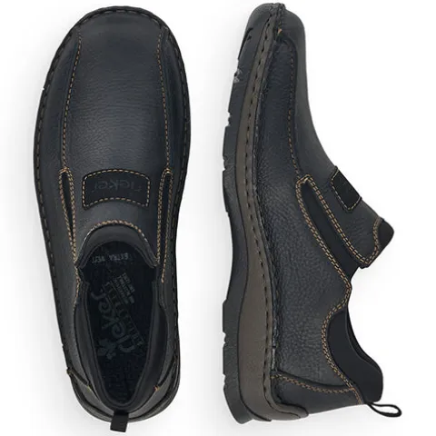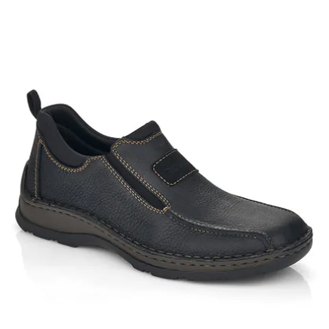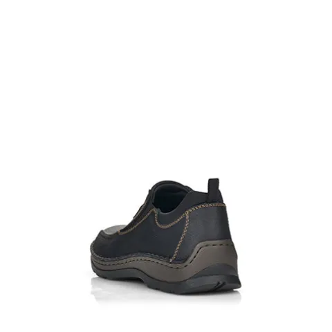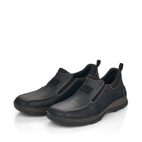 Afslappet sko fra Rieker med elastik i siderne og en god rummelighed. Skoen er designet med brune stikninger. Nem at tage på, og skoen sidder godt på foden. Indvendig er dæksålen i skind, og de bløde og fleksible gummisåler er med stødabsorbering.