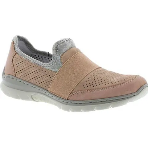 Slip in sko fra Rieker med bred elastik over vrist. Dæksål med Memosoft.