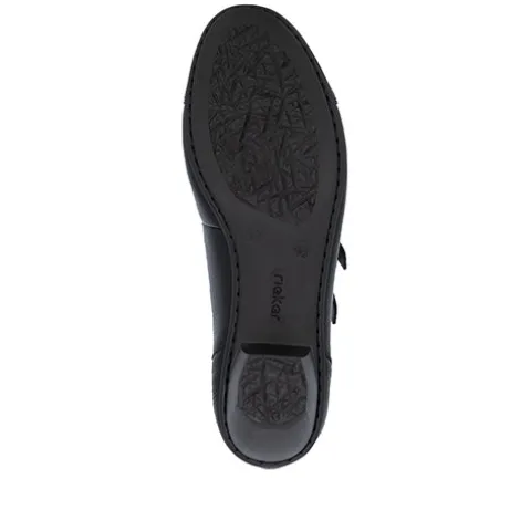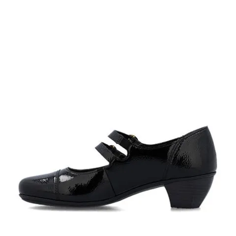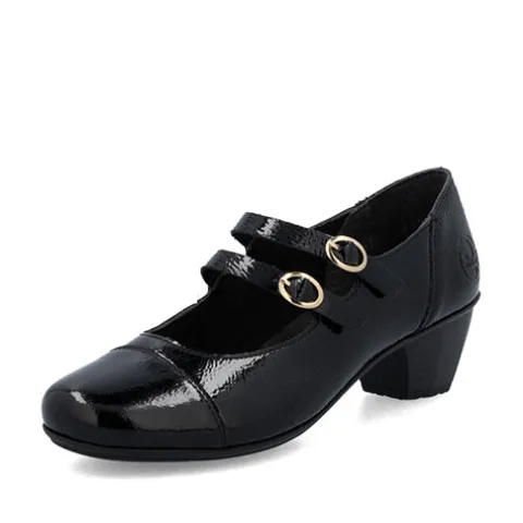 Smart damesko i Mary Jane-stil med Rieker Antistress for øget komfort. Overdelen er af lakeret skind og syntet foret med tekstil. Skoen lukkes over vristen med to smalle remme med spænde. Indersålen er beklædt med skind, og ydersålen er fleksibel og stødabsorberende.