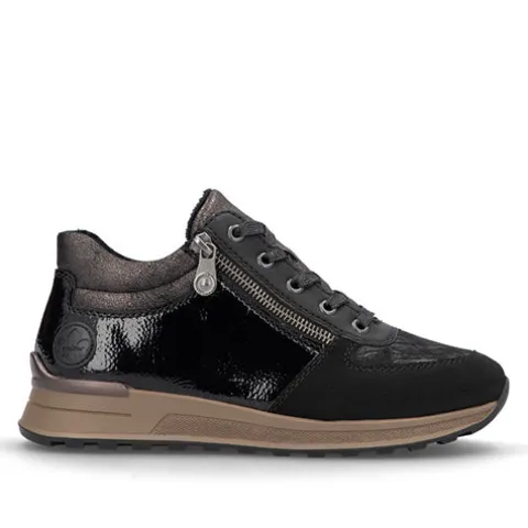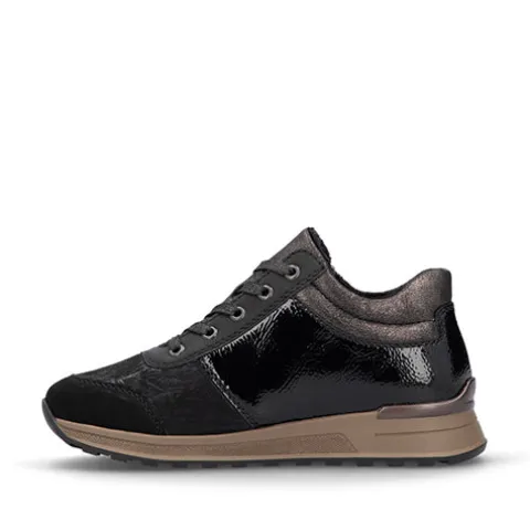 Let og høj sneaker med en overdel af tekstil, lakeret syntet, syntet i nubucklook og i læderlook, udstyret med et let og lunt foer indvendigt. Skoen justeres med snørebånd og lukkes med en lynlås på ydersiden. Den udtagelige Antistress-indersål er polstret og komfortabel, og den ekstra H-vidde giver mere plads om forfoden. Den fleksible ydersål er stødabsorberende med et fint vejgreb.