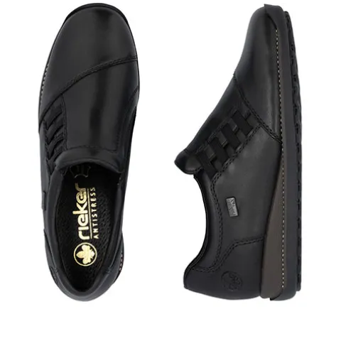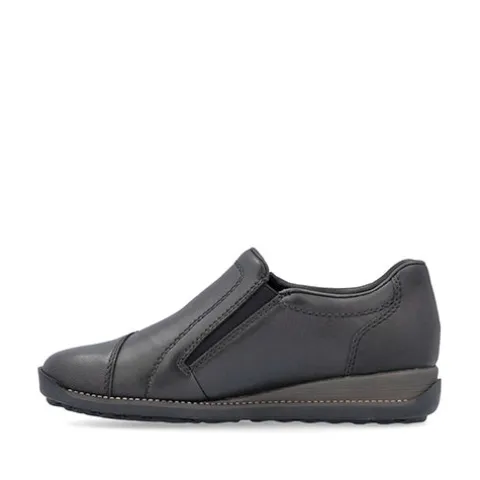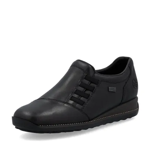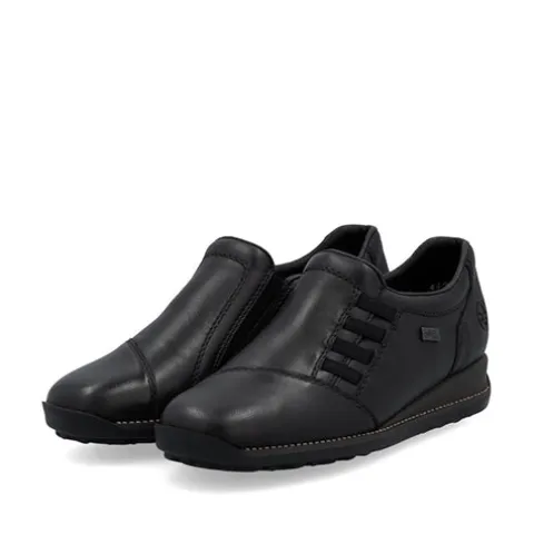 Fin sko med en overdel af glat skind og syntet og elastik i siderne. Skoen er en slip on-model med en smule polstring i insteppet, og indersålen er komfortabel. Med RiekerTEX er skoen kraftigt vandafvisende. Skoen har en lille kilehæl, og den fleksible gummiydersål er stødabsorberende med et godt fodfæste.
