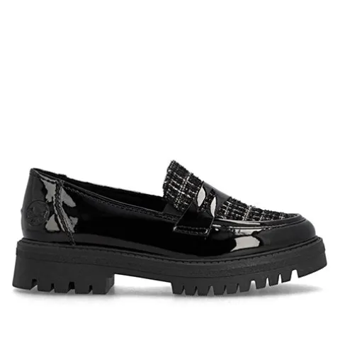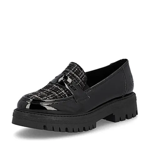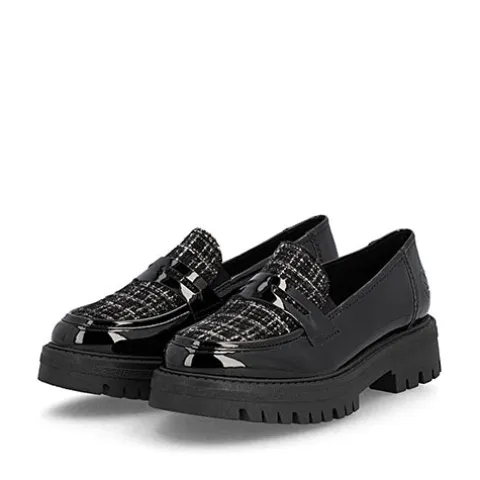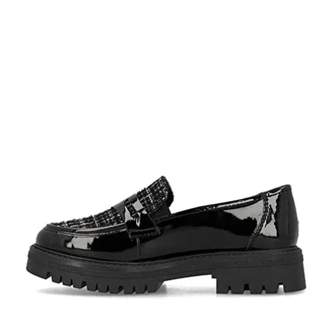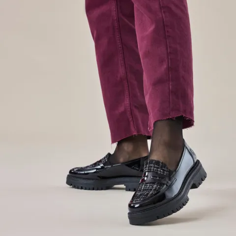 Flot loafer med en overdel af lakeret syntet og tekstil. Elastikkiler i åbningen gør skoen nem at træde i og sørger samtidig for løbende tilpasning til foden. Den komfortable Antistress-indersål er beklædt med skind, og den stødabsorberende gummiydersål giver et godt fodfæste. Ydersålen er chunky med en højde på ca. 3 cm under forfoden og ca. 4 cm under hælen. Disse loafers er perfekte til både hverdag og pænere anledninger.