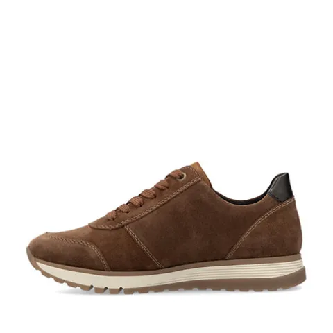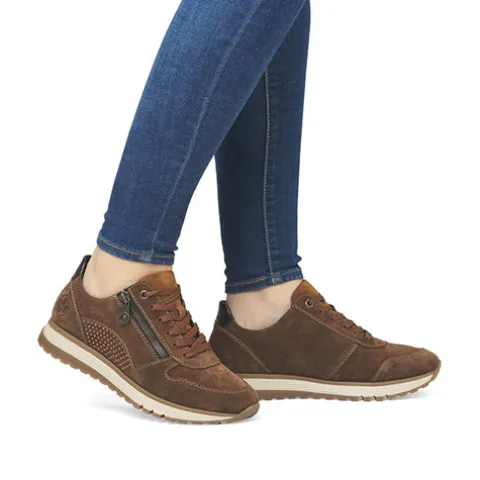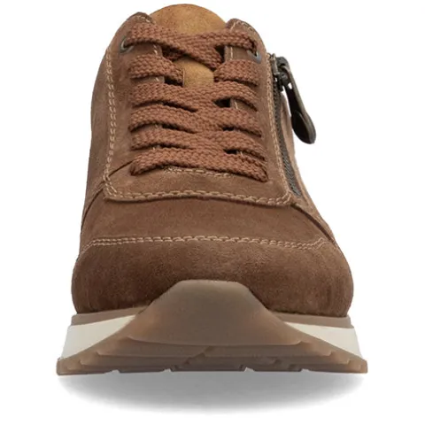 Flot og let sneaker med en overdel af ruskind dekoreret med brune similisten på ydersiden. Skoen justeres med snørebånd og lukkes med en lynlås på ydersiden. Den udtagelige Antistress-indersål er beklædt med skind og er åndbar, polstret og komfortabel, og med ekstra vidde om forfoden er der plads til den bredere fod. Den fleksible gummiydersål er stødabsorberende med et fint vejgreb.