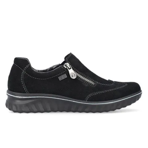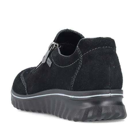 Dejlig og komfortabel sko med en overdel af ruskind med smarte syninger. Skoen lukkes med en lynlås på ydersiden, og på venstre side er isat en elastikkile, som gør skoen i stand til at tilpasse sig foden i løbet af dagen. Med en åndbar RiekerTEX-membran er skoen vandafvisende. Den udtagelige Antistress-indersål er polstret og komfortabel, og den kraftige ydersål er stødabsorberende med et fint fodfæste.