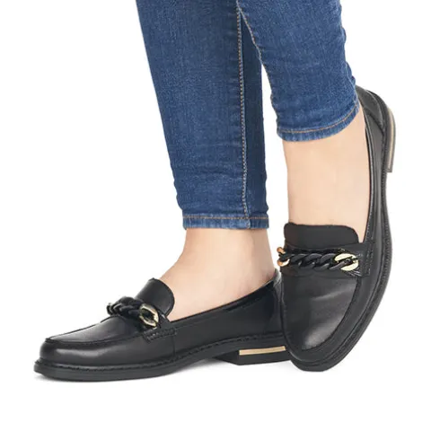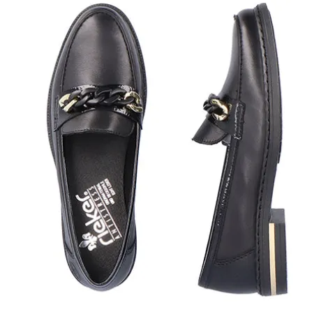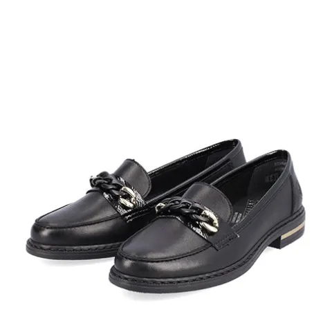Flot og let loafer fra Rieker med en overdel af glat skind med lakdetaljer, dekoreret med en guld- og sortfarvet kæde over vristen. Indersålen er af skind og er blød og komfortabel, og ydersålen er fleksibel. Hælen har en dekorativ guldstribe. Her får du et lækkert par loafers til både daglig brug og fest.