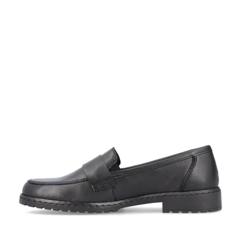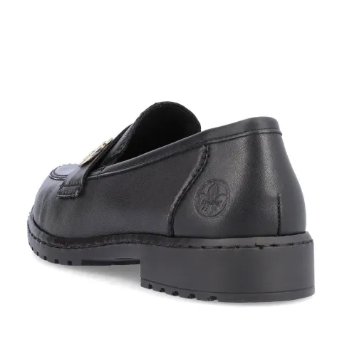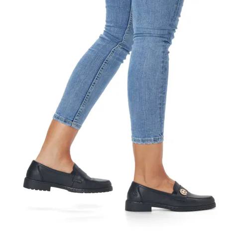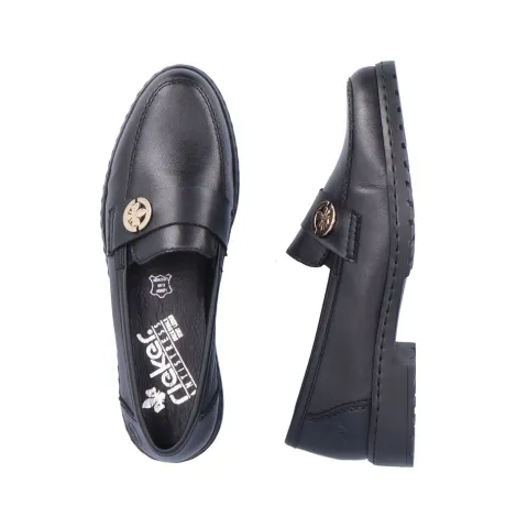 Blød og fleksibel loafer i blødt, glat skind. Skoen har en blød indersål af skind, elastik i begge sider af åbningen samt en flot gulddetalje (Rieker-logo) på remmen over vristen. Her får du et par loafers perfekt til både hverdag og fest.
