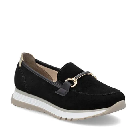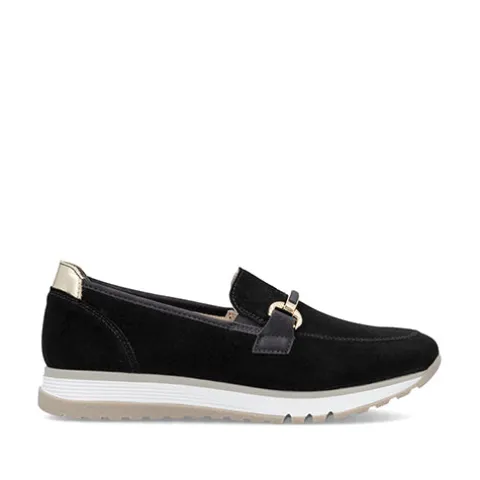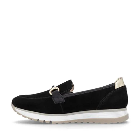 Dejlig loafer med en overdel af ruskind dekoreret med et guldfarvet krombidsel samt en guldfarvet detalje på hælen. Elastikkiler i åbningen gør det nemt at træde i skoen, som med vidde H giver ekstra plads og bevægelsesfrihed om forfoden. Den udtagelige indersål med Antistress-teknologi sikrer maksimal komfort, imens den fleksible gummiydersål er stødabsorberende med et godt fodfæste. Med en hælhøjde på 3 cm får du både stil og funktion. Disse elegante loafers er det perfekte valg til både hverdag og fest.