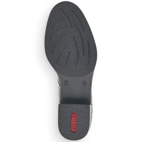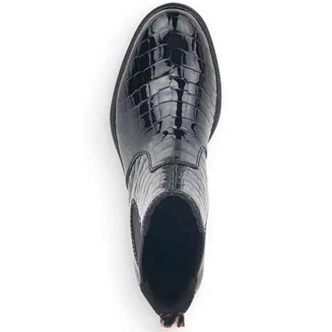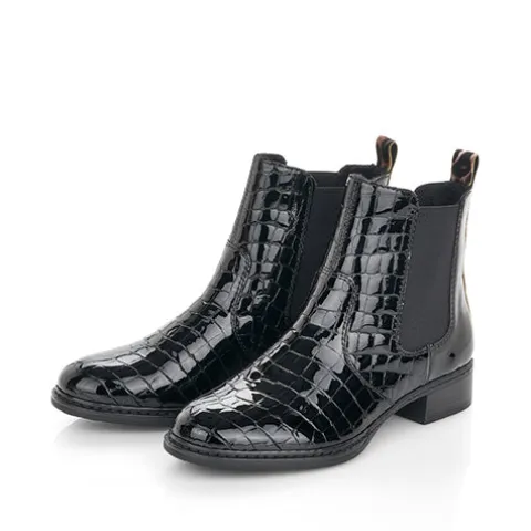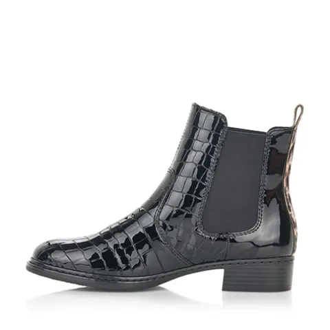 Flot Chelsea-støvle med en overdel af krokopræget lakeret skind og lakeret syntet med elastikpaneler på siderne samt et flot bånd med leopardprint bagpå. Indvendig har støvlen et blødt, let og lunt fleecefoer, og indersålen er komfortabel. Blokhælen giver et diskret løft.