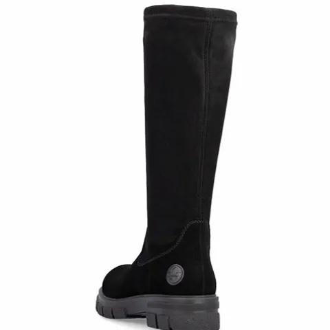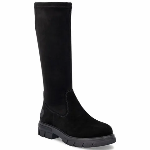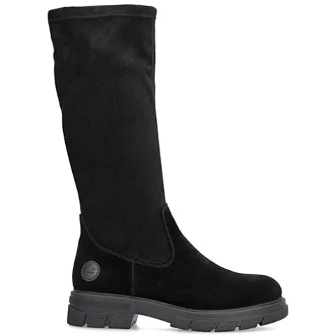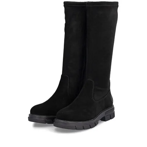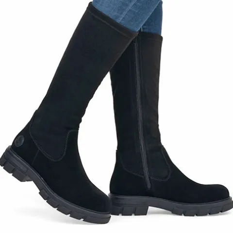 Lækker langskaftet støvle med en overdel af ruskind (foden) og elastisk mikro-stretch-tekstil (Vario-skaft), der sikrer en individuel pasform om læggen. Støvlen lukkes med en lynlås på indersiden af benet. Indvendig har støvlen et let tekstilfoer, og med komfortvidde er der lidt mere rummelighed om forfoden. Indersålen er komfortabel, og den chunky og godt mønstrede gummiydersål er stødabsorberende med et godt vejgreb.