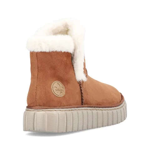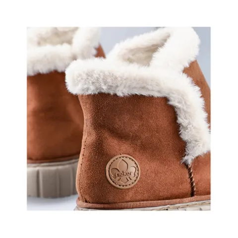 Lækker og meget let Rieker Lite ankelstøvle med en overdel af tekstil i ruskindslook og en åbning kantet med hvid faux pels. Støvlen er en slip-on-model med god plads til forfoden og tæerne, og et varmt foer holder dine fødder lune. Indersålen er komfortabel, og den fleksible og kraftige ydersål er stødabsorberende.