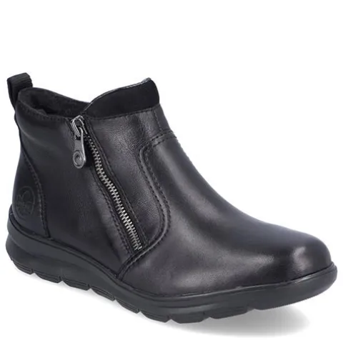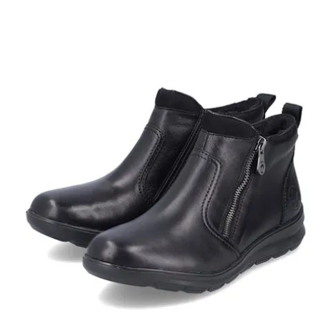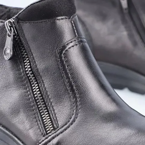 Lækker og let ankelstøvle til vintervejret. Overdelen er af glat skind med en syntetdetalje af imiteret skind på hælen, og indvendig har støvlen et varmt foer, der holder fødderne lune. Støvlen lukkes med en lynlås på begge sider af anklen, hvilket betyder, at støvlen kan åbnes helt op, så du nemt kan stikke foden i den, og en lille trækfane bagpå gør det endnu nemmere at træde i støvlen. Den udtagelige indersål er polstret, støddæmpende, åndbar og komfortabel, og den fleksible og kraftigt mønstrede gummiydersål er stødabsorberende med et godt fodfæste selv på våde og isede overflader.