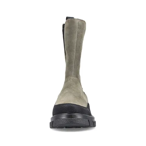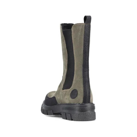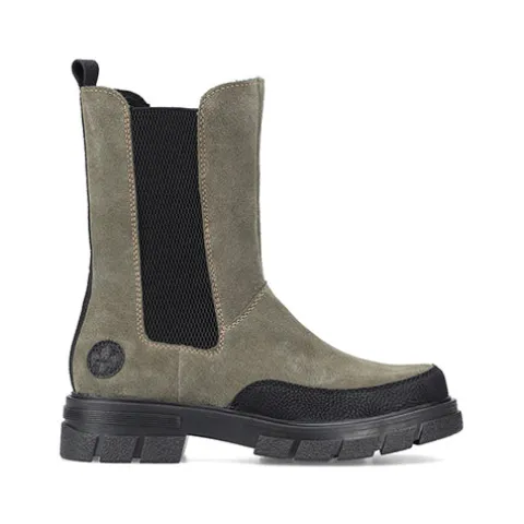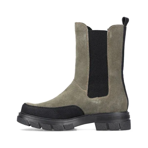 Flot chuncky støvle i armygrøn med en overdel af ruskind og sorte elastikpaneler på inder- og ydersiden af anklen, dekoreret med sorte detaljer op ad benet bag på anklen samt rundt ved tåen, og derudover lyse syninger. En trækfane går det nemt at komme i støvlen. Den kraftige ydersål giver et godt fodfæste.