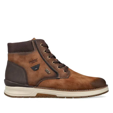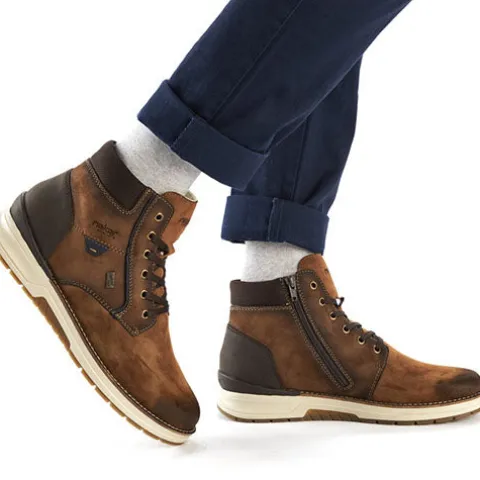 Flot vinterstøvle med en overdel af syntet i nubuck-look foret med ny uld. Støvlen justeres med snørebånd og lukkes med en lynlås på indersiden af anklen. Åbningen er polstret for øget komfort, og en vandafvisende RiekerTex-membran holder fødderne behageligt tørre. Med vidde H er der god plads om forfoden. Indersålen kan tages ud, og ydersålen er stødabsorberende med et fint vejgreb.