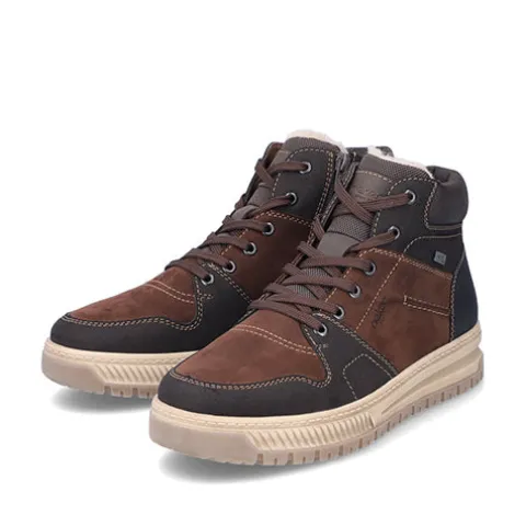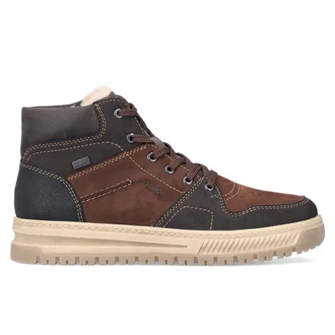 Lækker støvle med en overdel af nubuck og syntet, foret med varmt lammeuld. Støvlen justeres med snørebånd og lukkes med en lynlås på indersiden af anklen, og åbningen er polstret for øget komfort. Støvlen har ekstra vidde om forfoden, og en åndbar og vandafvisende Rieker tex-membran holder fødderne tørre. Antistress-indersålen er komfortabel, og den stødabsorberende ydersål giver et fint vejgreb. Flot ankelstøvle med kontrastsyninger i et sporty, flot design.