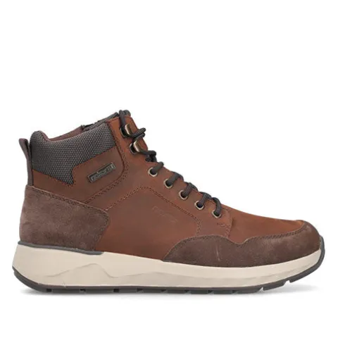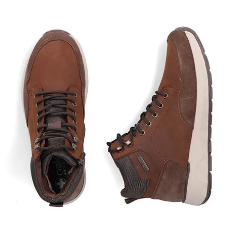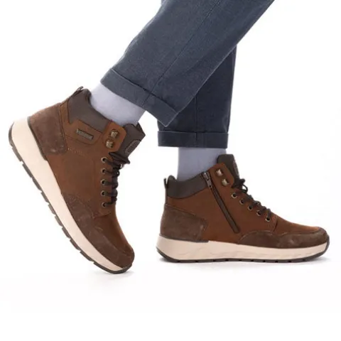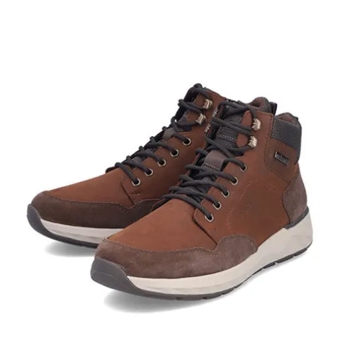 Dejlig vinterstøvle med en overdel af nubuck, ruskind og syntet foret med et varmt uldfoer, og med en RiekerTEX-membran er støvlen kraftigt vandafvisende, så fødderne holdes behagelige og varme. Støvlen justeres med snørebånd og lukkes med en lynlås på indersiden af anklen. Åbningen er polstret og har en trækfane bagpå. Med vidde H er der plads til den bredere fod. Indersålen kan tages ud, mellemsålen er stødabsorberende, og den mønstrede gummiydersål er stødabsorberende med et godt fodfæste.