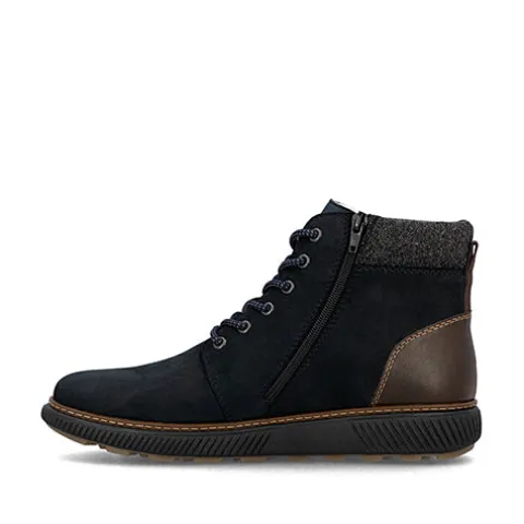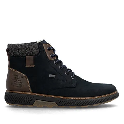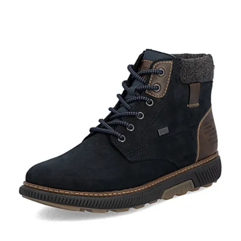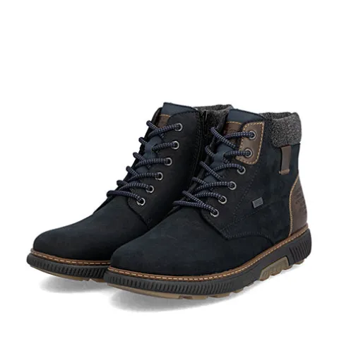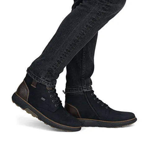 Dejlig ankelstøvle med varmt foer og Rieker-Tex. Overdelen er af nubuck og syntet, og indvendig har støvlen et varmt foer, der sammen med en kraftigt vandafvisende Rieker-Tex-membran sørger for varme og tørre fødder. Støvlen justeres med snørebånd og lukkes med en lynlås på indersiden af anklen. Åbningen er polstret for øget komfort, og med vidde H er der plads til den bredere fod. Den udtagelige indersål er polstret, støddæmpende og komfortabel, og den fleksible gummiydersål er stødabsorberende med et godt fodfæste.
