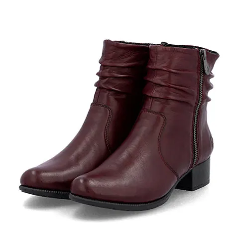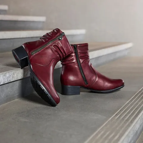 Lækker støvle med en overdel af glat skind, der er rynket om anklen på moderne vis. Støvlen har en lynlås på hver side af anklen, og selvom den på ydersiden godt kan åbnes, så er den mest til pynt. Indvendig har støvlen et let, lunt fleecefoer og en komfortabel indersål. Gummiydersålen er fleksibel, og den ca. 4 cm høje blokhæl giver et feminint look.