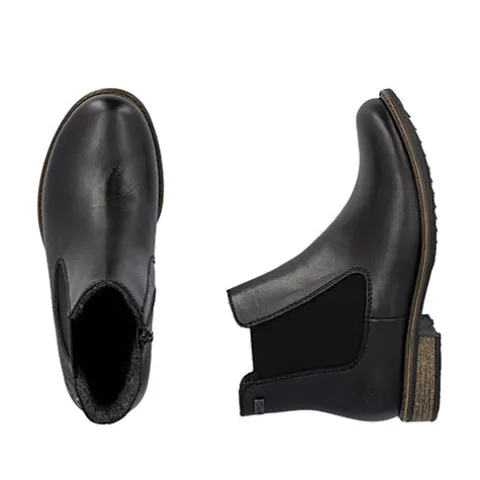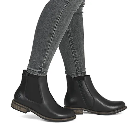 Klassisk ankelstøvle med en overdel af glat skind med et elastikpanel på ydersiden. Støvlen lukkes med en lynlås på indersiden af anklen. Med vidde H er der plads til den bredere fod. Indvendig har støvlen et blødt, let og lunt foer, og sammen med en kraftigt vandafvisende RiekerTex-membran holdes fødderne behagelige og lune. Den udtagelige indersål er polstret, åndbar, støddæmpende og komfortabel, og gummiydersålen er stødabsorberende med et fint fodfæste.