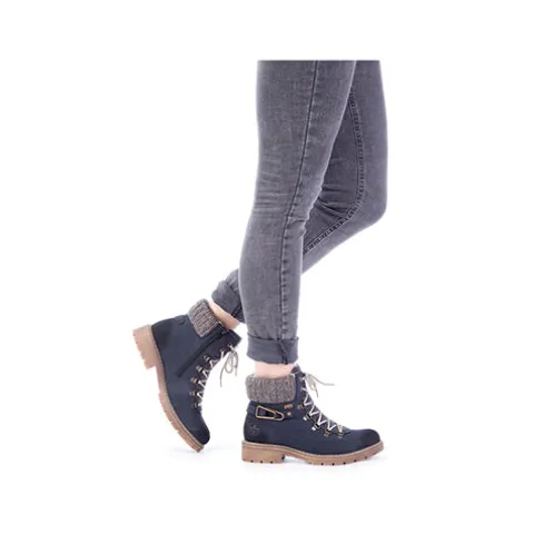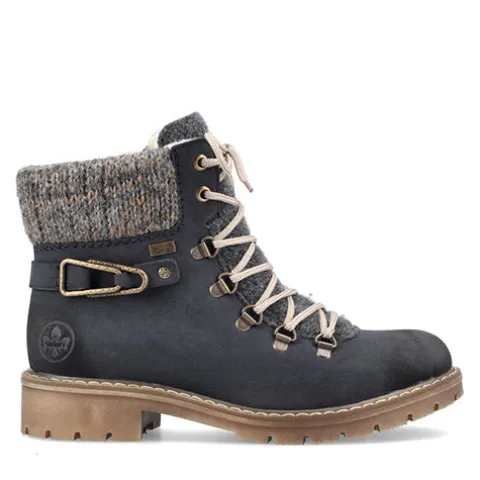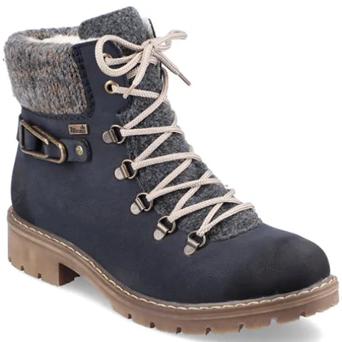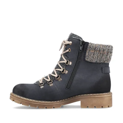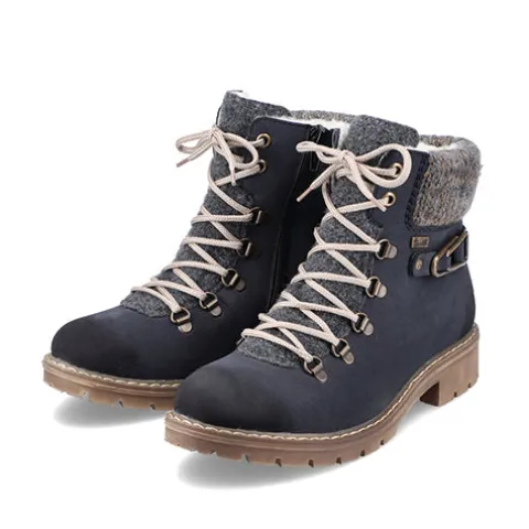 Dejlig vinterstøvle med en overdel af syntet i nubucklook med tekstil på pløsen og en bred og polstret strikket krave om åbningen. Ydersiden af hælen er dekoreret med en rem med pyntespænde. Støvlen justeres med snørebånd og lukkes med en lynlås på indersiden af anklen. Rieker-TEX gør støvlen vandafvisende, åndbar og vindtæt, og det varme foer holder fødderne lune. Indersålen er blød og komfortabel, og den kraftige ydersål er stødabsorberende med et godt vejgreb.
