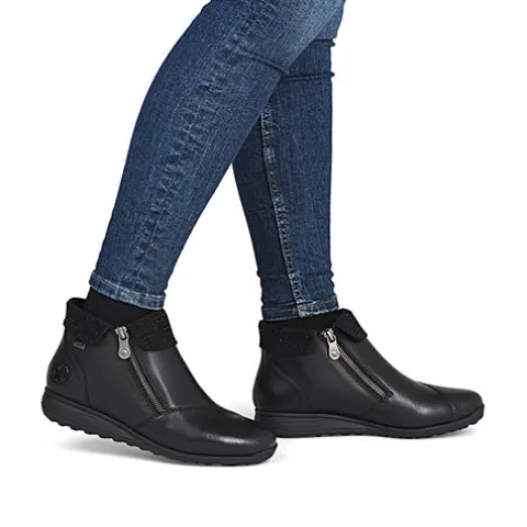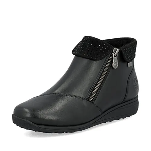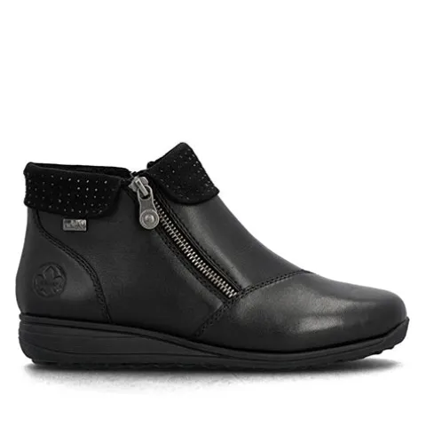Flot støvlet med varmt foer og Rieker-Tex. Overdelen er af glat skind dekoreret med sorte glitrende similisten på kraven. Indvendig har støvlen et varmt foer, og sammen med en kraftigt vandafvisende Rieker-Tex-membran holdes fødderne varme og tørre. Støvlen lukkes med to lynlåse på siderne. Med vidde H er der plads til den bredere fod. Den udtagelige indersål er polstret, støddæmpende og komfortabel, og den fleksible gummiydersål med en diskret kilehæl er stødabsorberende med et godt fodfæste.