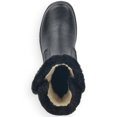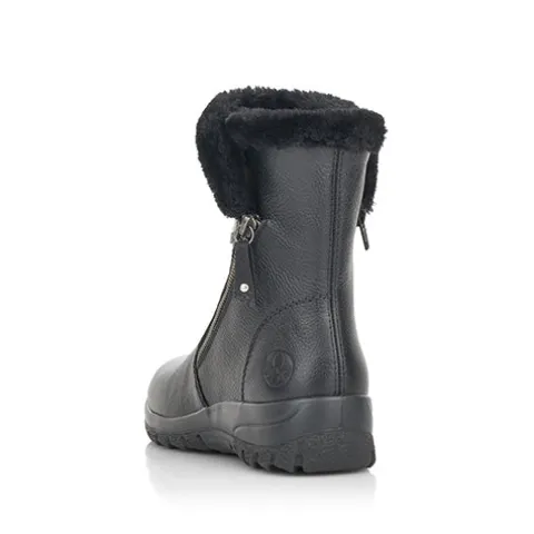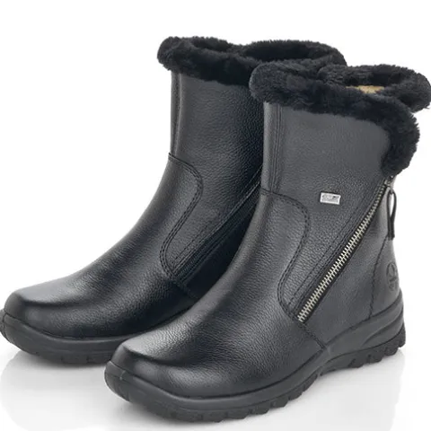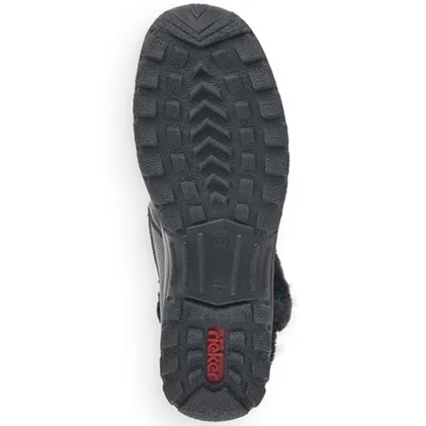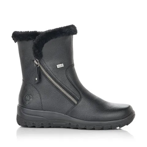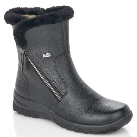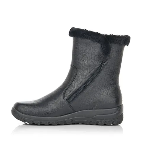 Dejlig vinterstøvle med en overdel af glat skind, dekoreret med en kant af faux pels omkring åbningen. Støvlen lukkes med to lynlåse, en på hver side af anklen. Støvlen er vandafvisende op til lynlåsen med RiekerTex-membran, og det varme uldfoer holder dine fødder lune hele dagen. Ydersålens grove mønster giver et fint fodfæste.