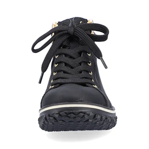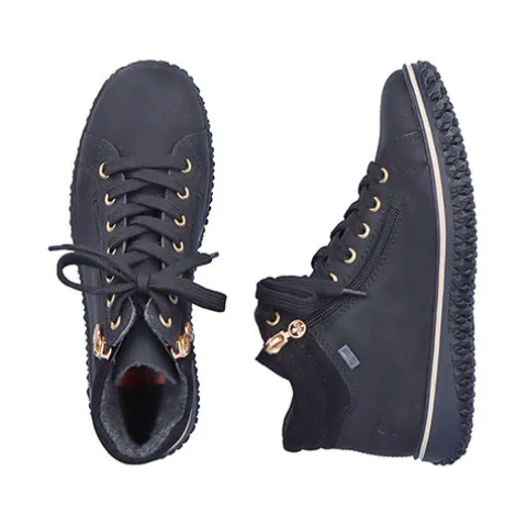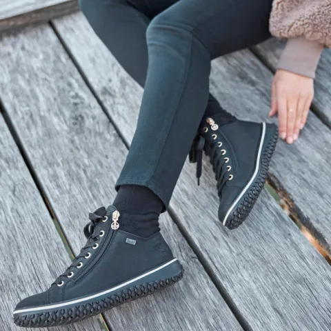 Smart, kort vinterstøvle med en overdel af slidstærkt syntet i læderlook. Støvlen justeres med snørebånd og lukkes med to lynlåse, så støvlen kan åbnes rigtig meget, hvilket gør det supernemt at træde i den. Med et varmt foer og RiekerTEX-membran holdes dine fødder lune hele dagen.
