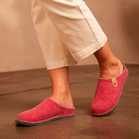 Flot hjemmesko fra Rohde med en overdel af filt dekoreret med en læderlap med logo foldet om kanten af åbningen. Den polstrede og komfortable indersål af skind kan tages ud, og ydersålen er belagt med gummi og giver dermed et godt fodfæste.