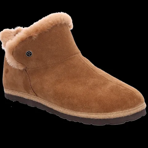 Varm og hyggelig hjemmesko med en overdel af ruskind, dekoreret med et lille metalemblem på ydersiden af anklen og foeret med blødt lammeskind, som også ses på kanten af åbningen. Den udtagelige indersål er polstret, komfortabel og belagt med lammeskindsfoer, og den fleksible ydersål beskytter mod kulde nedefra.