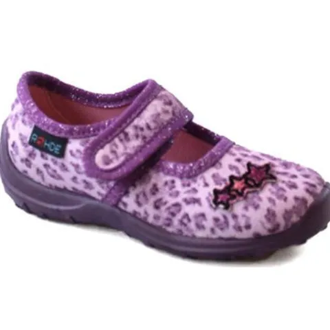 Blød børnehjemmesko med åndbare såler. Velcrorem over vristen og flot leopardprint med hjerter.