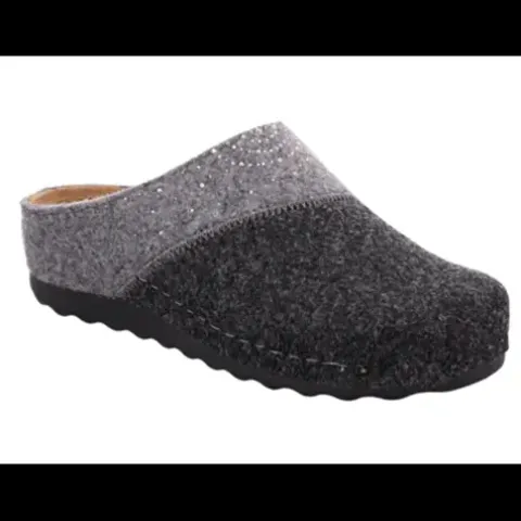 Lækker slippers-hjemmesko med en overdel af filt med metal-“sten” og en lille elastikkile på siden af åbningen. Den ruskindsbeklædte dæksål er polstret, mellemsålen med en diskret kilehæl er stødabsorberende, og den fleksible ydersål giver et fint fodfæste.
