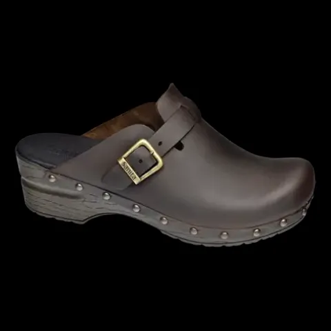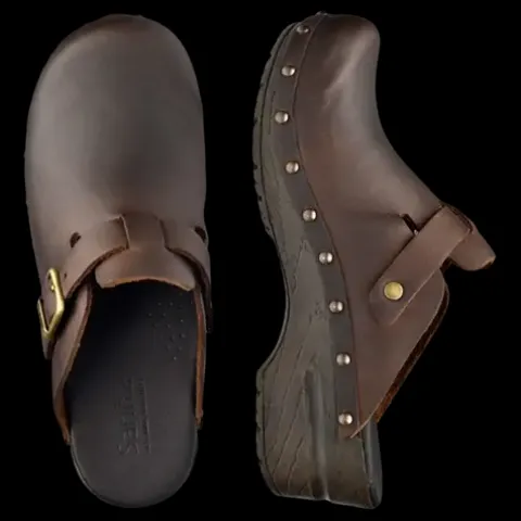 Lækker Original – Sanila Open Oil Leather træsko med en overdel af olieret skind med en justerbar rem med spænde over vristen og dekoreret med nitter rundt om kanten på mellemsålen. Dæksålen har en smule polstring, og indvendig er tåen forstærket med tekstil. Den kraftige mellem- og ydersål er stødabsorberende.