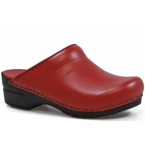 Åben træsko fra Sanita med PU-flexsåler. Overdelen er lavet i kraftig skind.