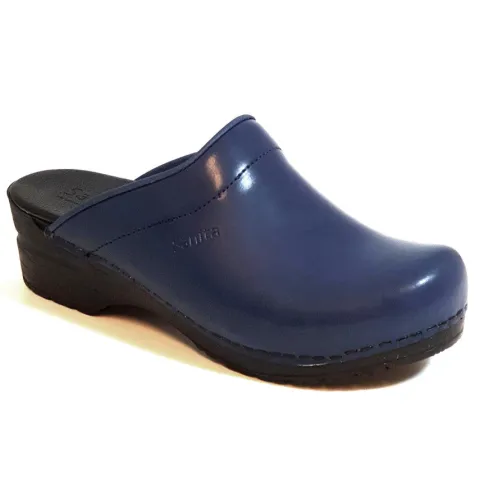 Åben Sonja Open træsko fra Sanita med PU-flexsåler. Overdelen er lavet i kraftig skind.